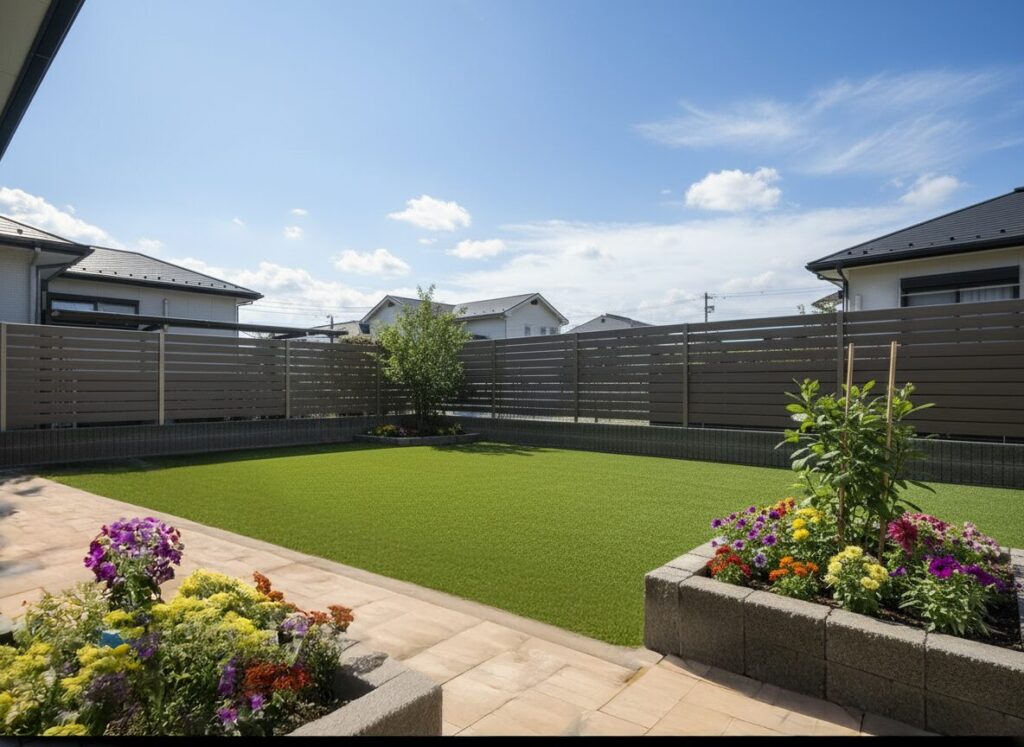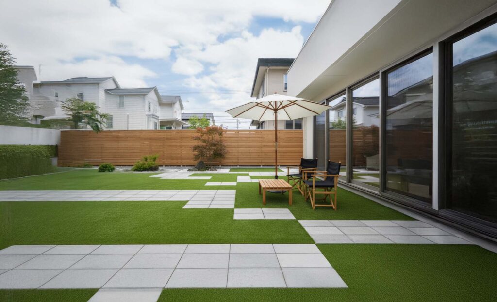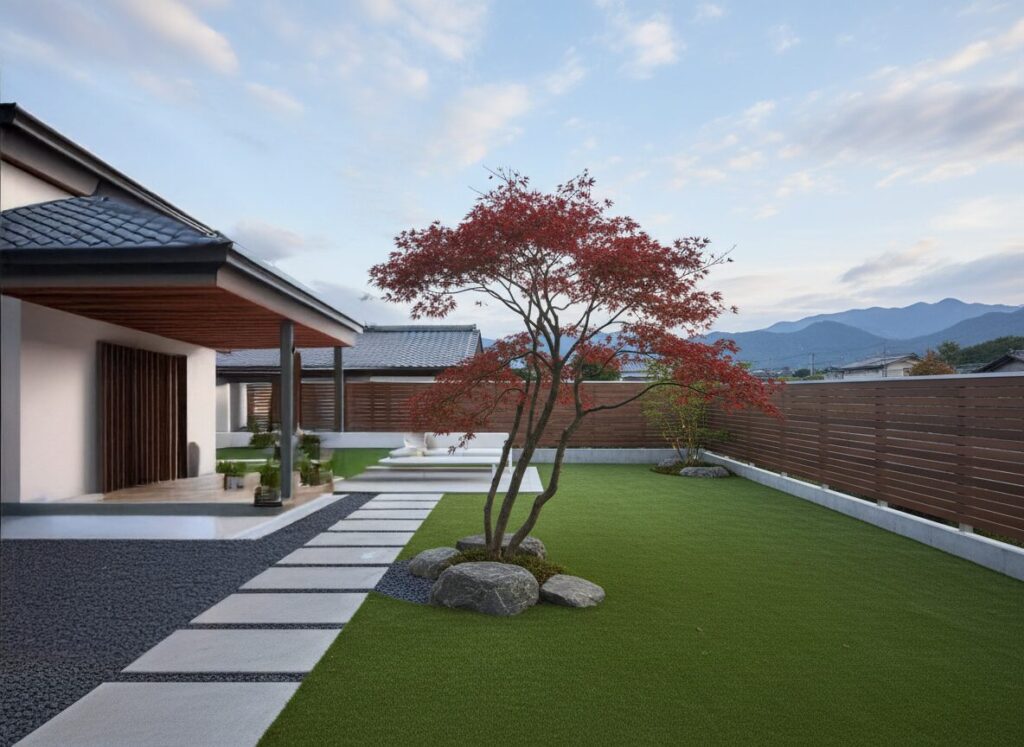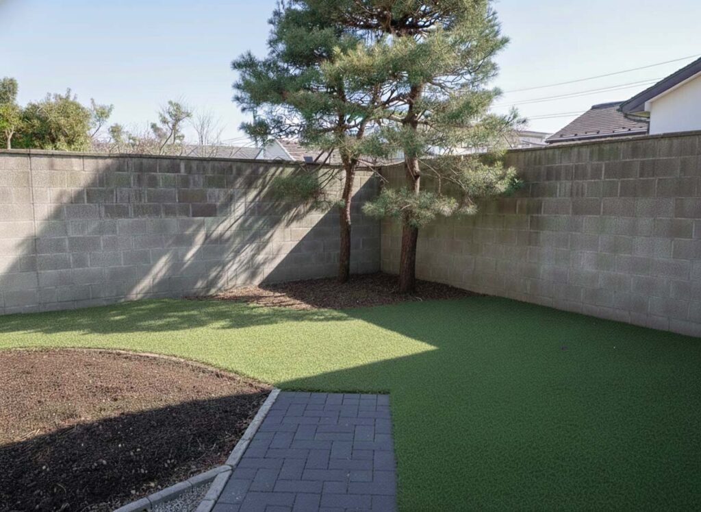 多くの植栽を整理し、厳選した一本のシンボルツリー。人工芝や砂利で構成された、モダンで洗練されたメンテナンスフリーの庭へ